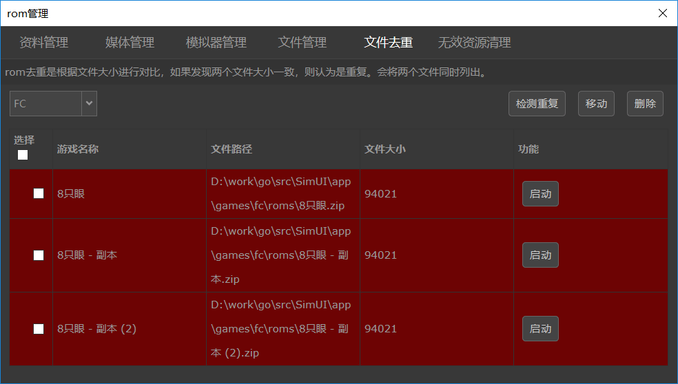 rom去重是根据文件大小来查询出大小一致的rom,方便清理重复rom