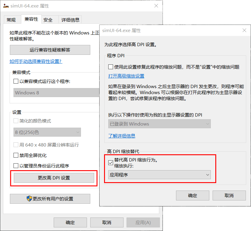 如果simUI在win10运行模糊,则打开simUI-64.exe属性,点击【更改高DPI设置】,勾选【替代高DPI缩放行为】,选项卡选择【应用程序】即可。